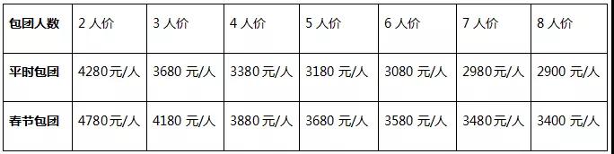 包團報價均按2人入住1標間核算,如出現單人,平時需另補房差700元/人,春節需另補房差900元/人。