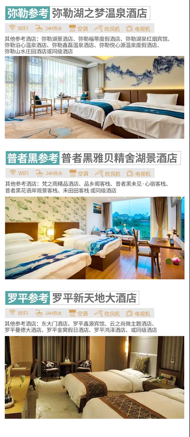住宿 :行程所列7晚當地酒店標間,并贈送集合日昆明四星酒店一晚。元陽景區酒店標間2晚、廣南準四酒店1晚、彌勒準四星酒店標間1晚、羅平縣三星酒店1晚、普者黑景區精品客棧或酒店1晚(景區內住宿均為攝影農家客棧標準間,不帶星級;因沿途條件有限,如酒店設施達不到您的期望,請您諒解)