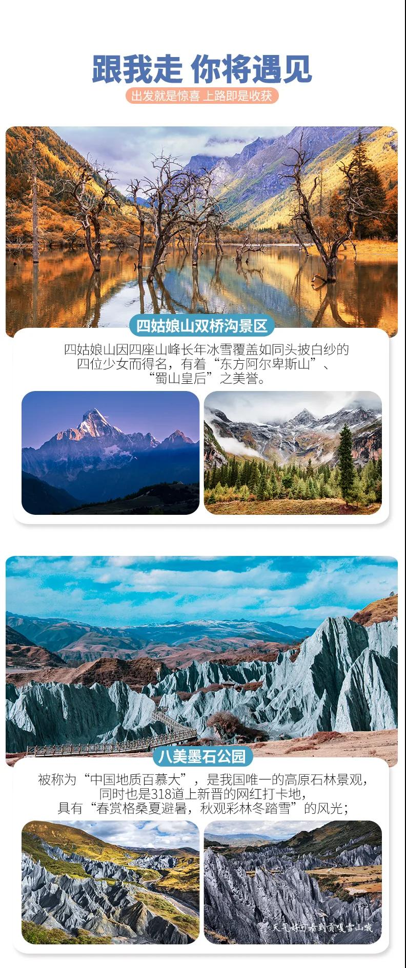 (3)如因道路維修或其他不可抗力因素,無法游覽四姑娘山雙橋溝景區(qū),則調(diào)整為游覽【碧峰峽】景區(qū),敬請諒解。