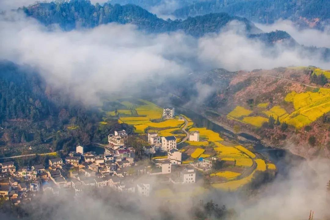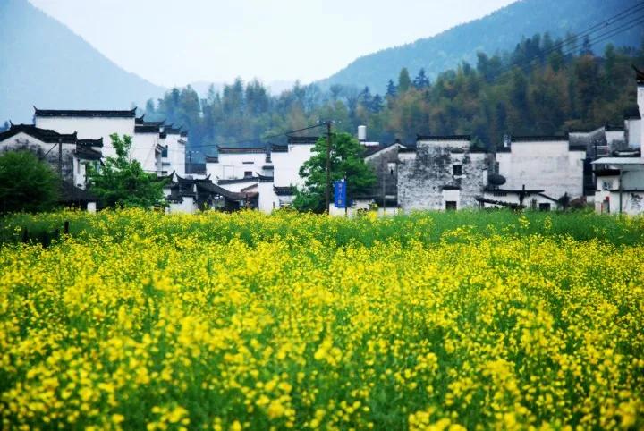 春天來(lái)臨時(shí),漫天金黃的油菜花將水墨色的徽派建筑照耀著,白墻青瓦反射著微黃色的光,細(xì)看之下,還有幾枝桃花點(diǎn)綴其中。村里裊裊炊煙一直飄到了青色的山上,與山上的煙霧糾纏在一起。這大概才是徽州真正的模樣。