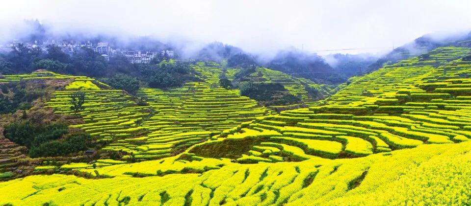 江嶺南臨曉起,東接溪頭,地處婺源縣最東北,是婺源最值得去的地方。站在山頂望去,腳下大片的山谷內(nèi),油菜花層層疊疊,一望無(wú)際,中間圍攏著幾個(gè)小小的村落,黑瓦白墻的徽派民居夾雜在一片金黃之間。