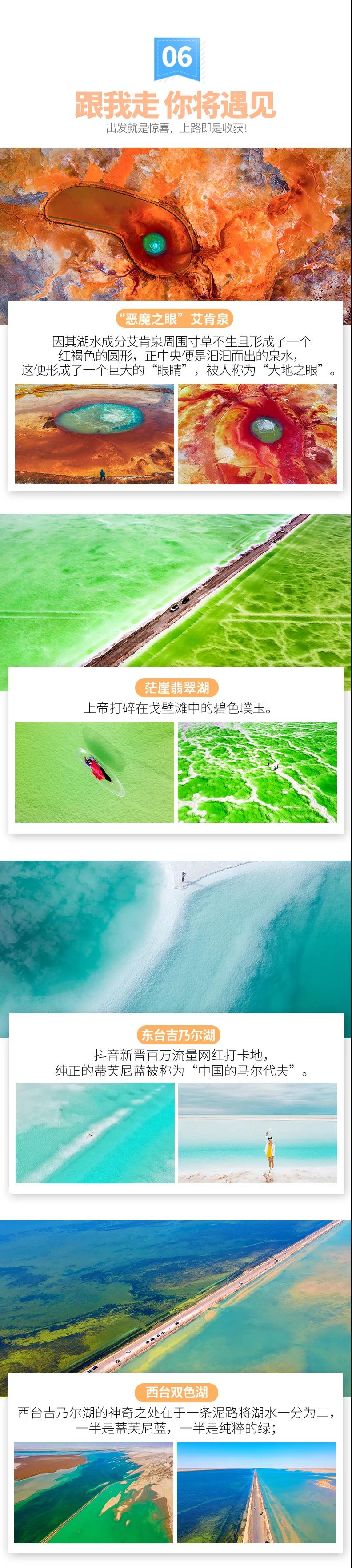 (5)茫崖翡翠湖、東/西臺吉乃爾湖、艾肯泉為小眾未開發景點,往年不設門票,若今年收費門票或環保費由游客自理。