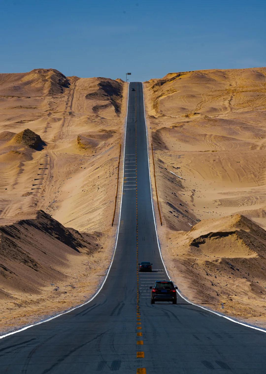 車子繼續向前行進,我們來到不遠處的沿著G315戈壁天路駛向大柴旦,一眼望不到盡頭筆直的數百公里公路,無需刻意挑選就是一派好萊塢大片風景,野性的路野性的起伏野性的自己,在這條路上你可以盡情感受公路旅行的自由。