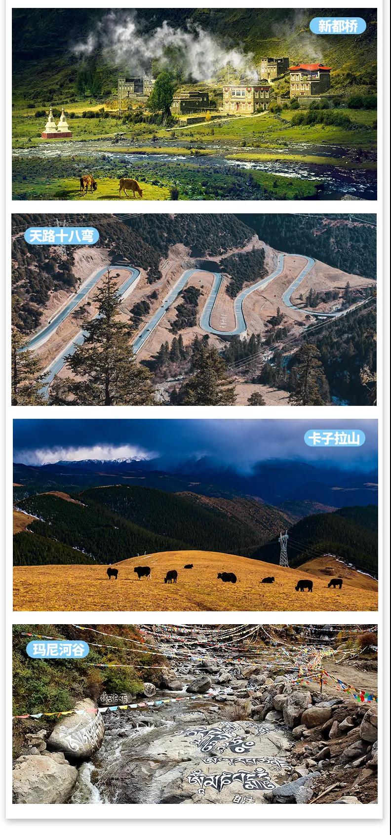 新都橋鎮(zhèn) — 雅江— 天路十八彎 — 卡子拉山埡口 — 理塘 — 兔兒山 — 海子山 — 香格里拉鎮(zhèn)