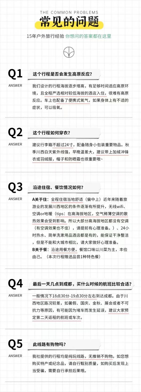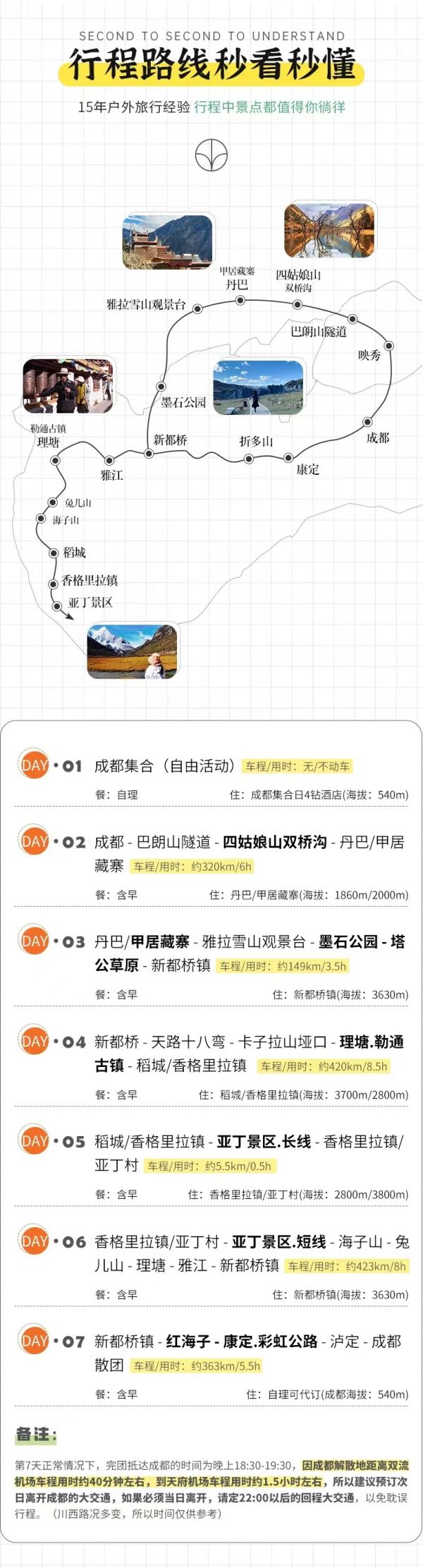 (1)以上行程時間安排可能會因天氣、路況等原因做相應(yīng)調(diào)整,正常情況下完團回到成都時間為晚上18:30至19:30左右,如果必須當(dāng)日離開,請定22:00以后的回程大交通,以免耽誤行程,敬請諒解;
