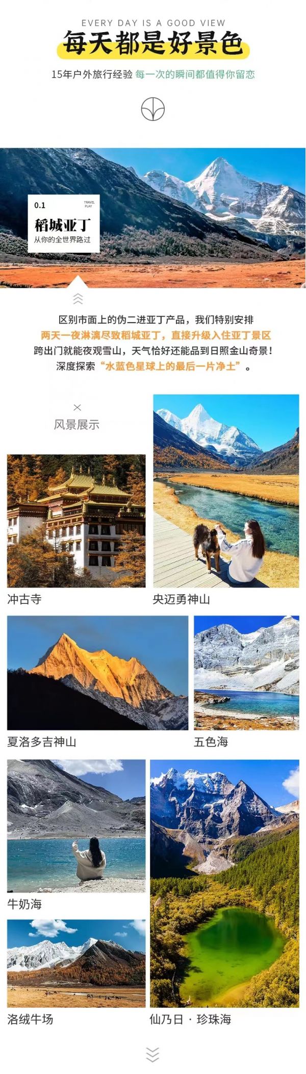 住宿:香格里拉鎮(zhèn)或亞丁村酒店標間說明”今天我們前往亞丁門票站換乘景區(qū)觀光車進入【稻城亞丁風(fēng)景區(qū)】,大概50分鐘后到亞丁村。在亞丁村用好午餐后,帶上簡單的行裝,抵達【扎罐崩】后徒步長線(往返10公里),徒步500米乘坐電瓶車(自理往返80元/人、單程50元/人,建議乘坐電瓶車節(jié)省體力)前往【洛絨牛場】(如徒步需單程1 — 2小時左右達到洛絨牛場)。這里是觀【夏諾多吉神山】(意為金剛手菩薩,海拔5958米)【央邁勇神山】(意為金文殊菩薩,海拔5958米)的最佳地點,是稻城亞丁核心景區(qū)最具代表性的景點,一望無垠的草甸,一條如飄帶般柔美的河流在上面隨意的奔騰著,神山圣水與心共鳴,盡情沉醉在這夢幻之地吧。