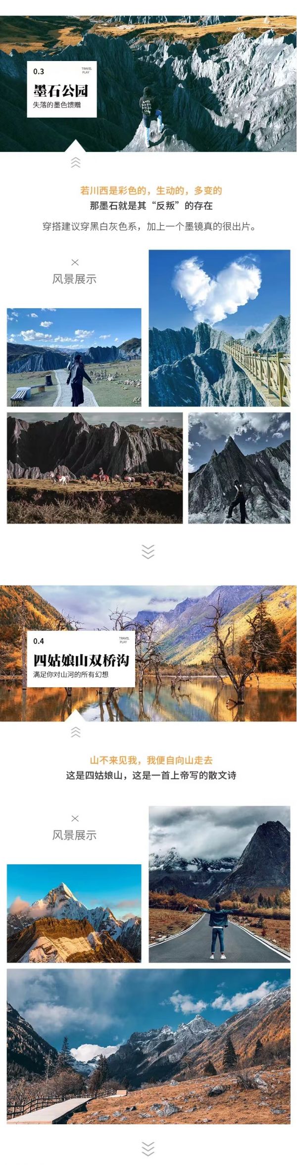 住宿:丹巴縣酒店或甲居藏寨民宿標間說明”早餐后酒店集合出發(fā),沿岷江而上,沿途經(jīng)都江堰、紫坪埔水利工程,沿都汶高速抵映秀,沿途感受2008年汶川大地震“地動山搖、山崩地裂、滄海桑田”后的景象,感悟大自然的力量;觀看震后統(tǒng)一重建的具有民族特色的民居,感受人定勝天的威力。而后從映秀出抵耿達鄉(xiāng)沿臥龍峽谷,欣賞峽谷小橋、流水、枯藤、老樹的美麗風(fēng)光,而后經(jīng)巴郎山可觀映山紅、紅白杜鵑花、松蘿、高山草甸等;觀看植物從常綠闊葉林到高山荒漠的垂直變化,感受“一山觀四季、十里不同天”的氣象變遷。中午抵達四姑娘山。午餐后游玩雙橋溝,景區(qū)開闊平坦、景點集中,全程通車。雖已開發(fā),但環(huán)境維護的出于意料的好,景區(qū)內(nèi)各種服務(wù)包括指示也十分清晰明了,游客們可以更加舒適、方便的游覽整個景區(qū)。由于整條溝海拔落差達到一千多米,所以地貌比較豐富,風(fēng)景也完全值得期待。給人遠離塵世的感悟。游玩盡興后出溝前往丹巴或小金入住酒店休息。