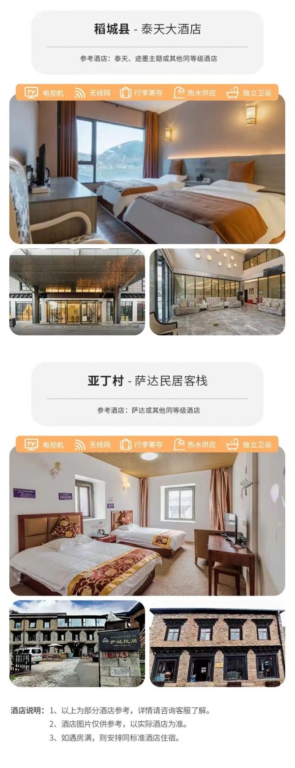 住宿:稻城或香格里拉鎮(zhèn)酒店標間說明”起個大早,晨暉中新都橋景色如畫:小橋、揚樹、水溪、人家、藏式民居,濃郁的高原風(fēng)情畫卷。經(jīng)雅江,翻過高爾寺山(4412米)、剪子灣山(4659米)、后翻越卡子拉山(4718米),在西俄洛觀景臺還可以欣賞到“會當(dāng)臨絕頂,一覽眾山小”的壯觀景象,抵達世界高城,高原明珠丁真的故鄉(xiāng)——理塘縣(海拔4000米)。游勒通古鎮(zhèn),觀千戶藏寨(位于理塘縣城北老城區(qū)),這里由13個藏寨4000余戶藏房集中而成的藏區(qū)最為集中,規(guī)模最為宏大的千戶藏寨群,有距今400余年歷史的七世達賴故居——仁康古屋。后繼續(xù)出發(fā),覽美麗的無量河風(fēng)光后翻越兔兒山風(fēng)景區(qū)、海子山自然保護區(qū)(H4500—5030米,是青藏高原最大的古冰體遺跡),經(jīng)桑堆(桑堆紅草地是季節(jié)性的景點,只有秋天才能看到,此處有當(dāng)?shù)厝耸召M,需自理),后經(jīng)稻城白塔,沿途欣賞萬畝楊樹林公園、赤土河谷迷人風(fēng)光、世外桃源般藏式村寨,抵達酒店辦理入住。