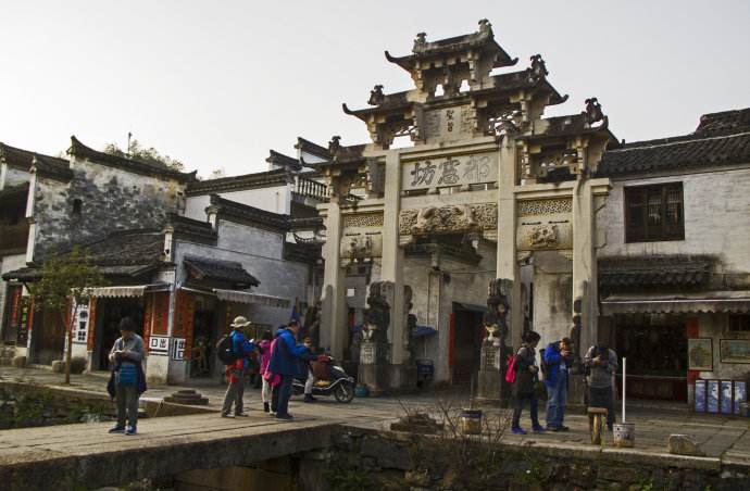 村中有祠堂、廟宇、橋梁各一百零八座;有孝子坊、貞節坊、官宦牌坊等十八座。古村老式民居鱗次櫛比,黝黑的屋瓦,淺灰的馬頭墻連成一片。大部分房子還都住人,可以像串門般地隨意進入居民家中轉悠。主人早已習慣,自管自忙活著;多有善意的笑容,但并不以特別的關注,使人更感自在親切。