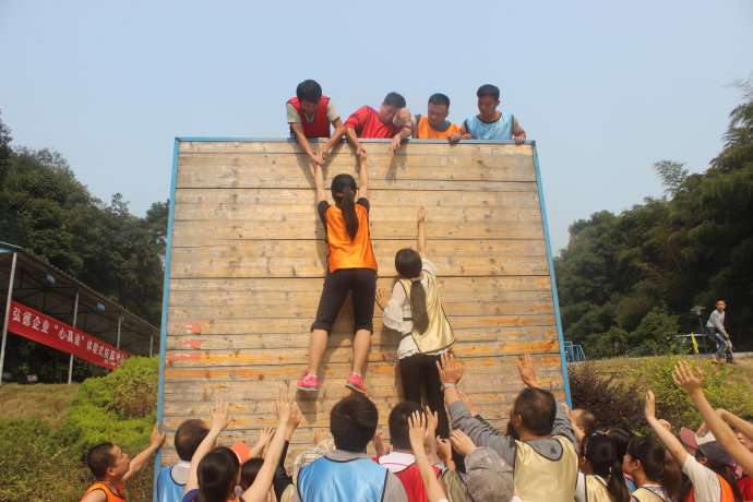 項目介紹:因為常常將它安排在最后一個項目,所以也叫逃生墻或者勝利墻,國外通常稱14英尺墻。全隊所有成員在規(guī)定的時間內(nèi)翻越一面高4.2米的光滑墻面,在此過程中,大家不能借助任何外界的工具,包括:衣服、皮帶、繩子等。所能用的資源只有每個人的身體。