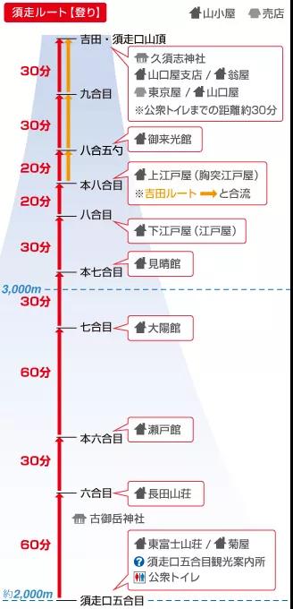 登山道跟下山道是完全分開的,登山道有很多山間小屋可以休息,而下山道就幾乎沒有小屋。在五合目、七合目和八合目分別建有救護所。商店也是最多的,食堂、休息室、旅館都有,登山的便利性最好。