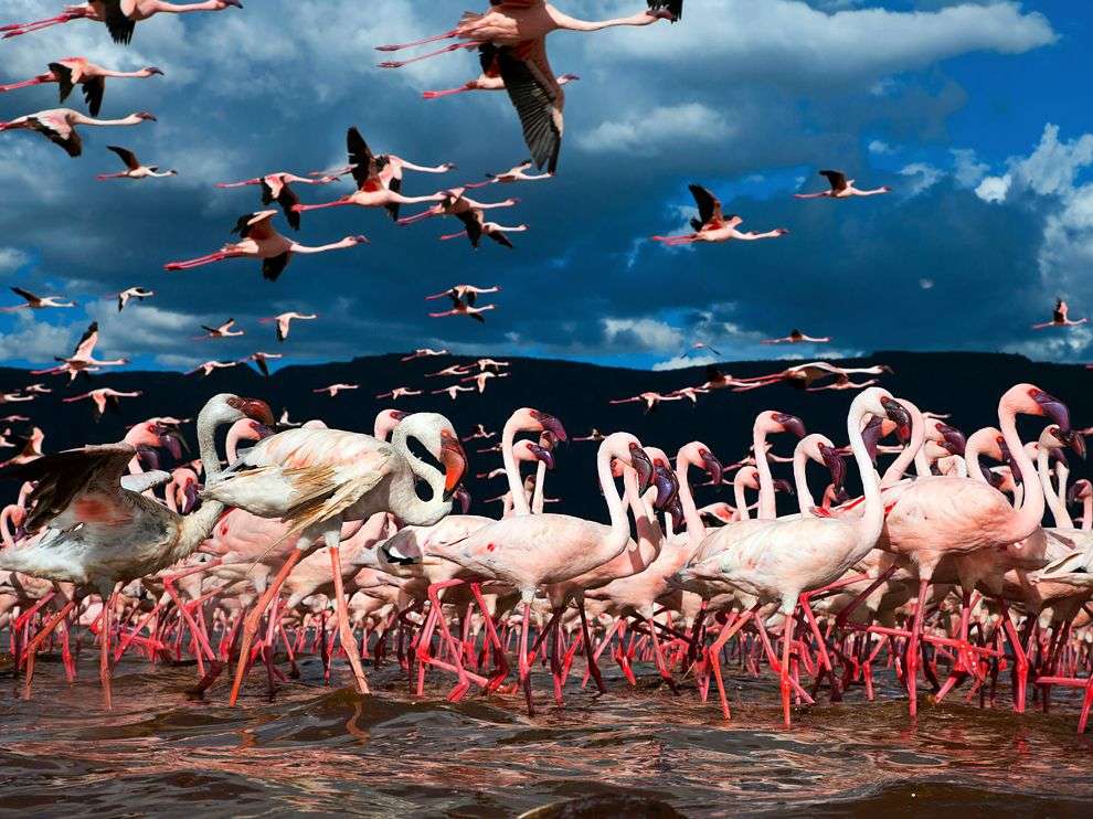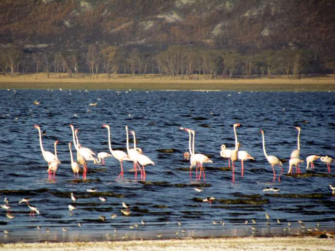 東非大裂谷還是一座巨型天然蓄水池,非洲大部分湖泊都集中在這里,大大小小約有30來個,例如阿貝湖、沙拉湖、圖爾卡納湖、馬加迪湖、馬拉維湖、坦噶尼喀湖等。這些裂谷帶的湖泊,水色湛藍,遼闊浩蕩,千變萬化,不僅是旅游觀光的勝地,而且湖區水量豐富,湖濱土地肥沃,植被茂盛,野生動物眾多,大象、河馬、非洲獅、犀牛、羚羊、狐狼、紅鶴、禿鷲等都在這里棲息。坦桑尼亞、肯尼亞等國政府,已將這些地方辟為野生動物園或者野生動物自然保護區,比如,位于肯尼亞峽谷省省會納庫魯近郊的納庫魯湖,是一個鳥類資源豐富的湖泊,共有鳥類400多種,是肯尼亞重點保護的國家公園。在結眾多的鳥類之中,有一種名叫弗拉明哥的鳥,被稱為世界上最漂亮的鳥,一般情況下,有5萬多只火烈鳥聚集在湖區,最多時可達到15萬多只。當成千上萬只鳥兒在湖面上飛翔或者在湖畔棲息時,遠遠望去,一片紅霞,十分好看。