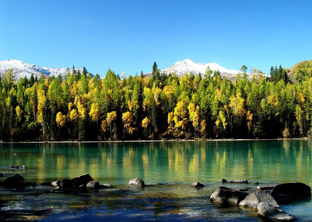 一進(jìn)入9月,喀納斯便進(jìn)入了純金的時(shí)節(jié)。天高云淡,藍(lán)天如洗,層林盡染,滿目流金,深綠的山坡上透出一片片黃枝紅葉相間、青山白雪相連的色塊,湖畔的白樺、紅松、冷杉等樹(shù)木會(huì)以金黃、橙紅、黛綠等交叉的色彩,烘托著山頂耀眼的雪色,投映在翡翠石般的喀納斯湖上,光彩奪目,令人沉醉。此時(shí)也是攝影的最佳時(shí)節(jié)。