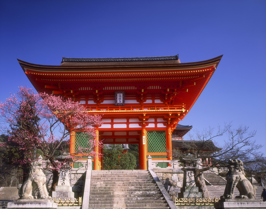 本堂的下方有著名的“音羽瀑布”,與祈求分娩順利的“子安塔”,后者被列為世界文化遺產(chǎn),清水寺建于音羽山上,為日本佛教北法相宗的總院。寺院周圍是京都的名勝古跡,春天櫻花盛開,秋天紅葉似火。