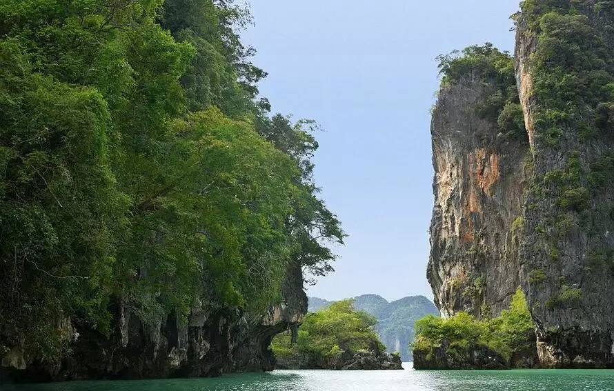 攀牙灣山峰聳峙,海景如畫(huà),風(fēng)光雄渾壯麗,酷似桂林的山水:屏干島,由兩面山峰傾斜地相疊一起,呈倒V