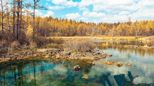 哈拉哈河進入石塘林之后有時流淌于地面,忽而又沉入地下;有時是水流湍急的瀑布,剎那間又造就了星羅棋布般的池塘與湖泊。清清的河水流經石塘林,為石塘林中的萬物提供了無限的生機。