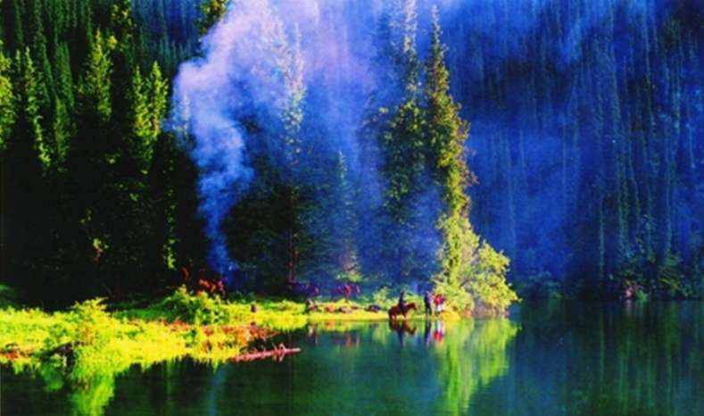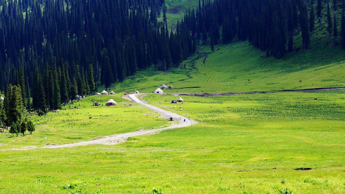 從夏塔古城向南一走到入山口,道路兩邊一個高過一個的高大土堆幕鱗次櫛比,向人們展現(xiàn)了烏孫時期國力的強大與草原文化的具體內涵,入山以后,自然景色漸漸秀麗,兩邊茂密的原始森林懸掛在人們視線內的半山腰,其中溝的西邊有現(xiàn)代當?shù)鼐用窭靡粋€小山坡半自然地圈養(yǎng)鹿場;向南古道迂回攀升,異常險峻,在短短的一公里范圍內,相對高度增加了200多米,在向山上走,前面豁然開朗。
