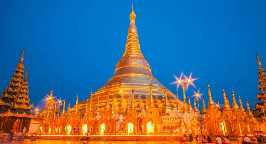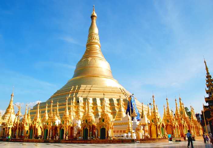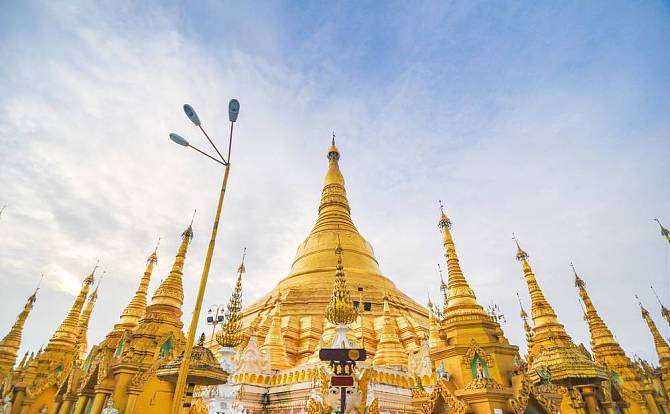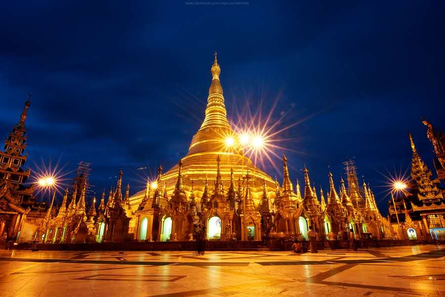 其高度為98米,表面則鋪上了一層金,再加上它是位于皇家圓林西的圣山(Singuttara)之上,所以這座塔也就在仰光市天際線中獨占鰲頭了。它是緬甸中最神圣的佛塔,因為它供奉了四位佛陀的遺物,包括是拘留孫佛(Kakusandha)的杖,正等覺金寂佛(Konagamana)的凈水器,迦葉佛(Kassapa)的袍及佛祖釋迦牟尼的八根頭發(fā)。全塔上下通體貼金,加上4座中塔、64座小塔,共用黃金7噸多!在塔頂?shù)慕饌闵希€掛有1065個金鈴、420個銀鈴,上端以純金箔貼面,頂端鑲有5448顆鉆石和2000顆寶石。