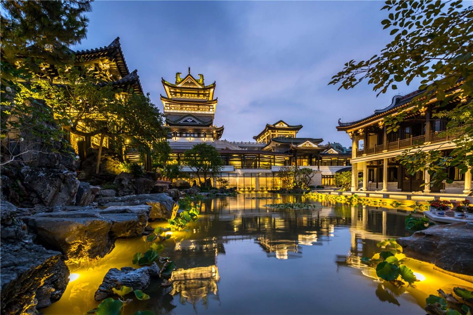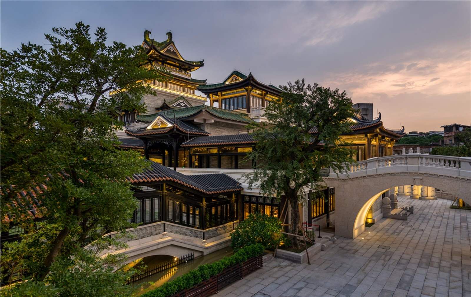 博物館總占地面積1.72萬平方米,建筑面積2.17萬平方米,沿荔枝灣涌三期分為南北兩岸,建筑形制為嶺南園林風(fēng)格的仿古建筑群,內(nèi)設(shè)基本陳列展廳、主題展廳、劇場、園林景區(qū)以及粵劇藝術(shù)傳承與保護(hù)等配套區(qū)域。園林景區(qū)由嶺南園林風(fēng)格的仿古建筑群組成,總體布局沿十字軸骨架排布,環(huán)繞中心晚沙湖,錯落六組院落空間,院院相連又相對獨(dú)立,以傳統(tǒng)建筑工藝、技法的“三雕二塑一嵌” (木雕、磚雕、石雕、灰塑、陶塑、嵌瓷)為裝飾亮點。