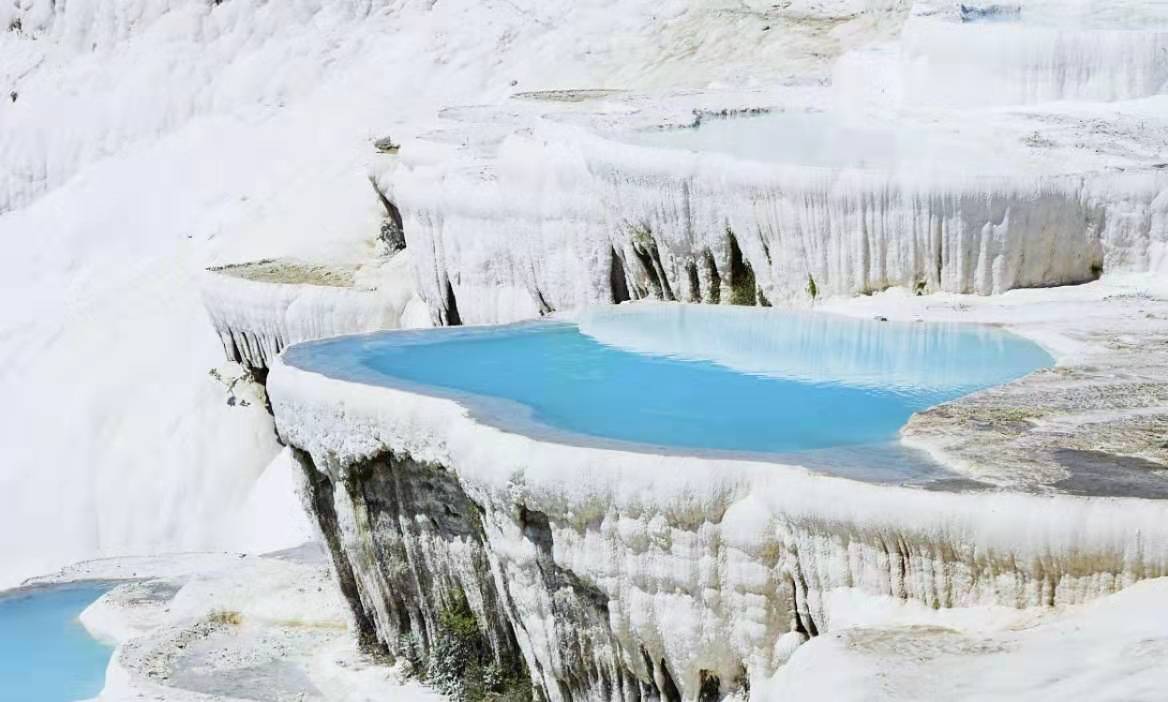 有山有水的白色棉花堡,從2千年前的希臘時代起就是溫泉療養(yǎng)勝地,如今更是遠近馳名,成為土耳其最重要的觀光景點之一。泉水從山頂往下流,所經之處歷經千百年鈣化沉淀,形成層層相疊的半圓形白色天然階梯,遠看像大朵大朵棉花矗立在山丘上,所以土耳其人叫它為棉花堡。美麗的露天浴場,清澈的泉水中,還可看到2千多年的希臘石柱。當地水溫攝氏36度至38度之間,酸堿值6左右,泉水富含鈣、鎂等礦物質,可供飲用及沐浴,對于風濕、皮膚、婦科、消化不良、神經衰弱等皆有療效。