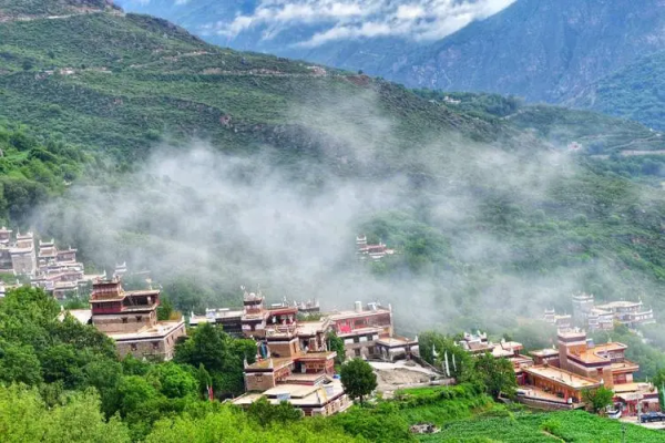 “甲居”,藏語是百戶人家之意。藏寨從大金河谷層層向上攀緣,一直伸延到卡帕瑪群峰腳下,整個山寨依著起伏的山勢迤邐連綿,在相對高差近千米的山坡上,一幢幢藏式樓房灑落在綠樹叢中。或星羅棋布,或稠密集中,或在高山懸崖上,或在河壩綠茵間,不時炊煙裊裊、煙云繚繞,與充滿靈氣的山谷、清澈的溪流、皚皚的雪峰一起,將田園牧歌式的畫卷展示在人們眼前,以一種藝術(shù)品的形態(tài)存在。2005年由《中國國家地理》雜志組織的選美中國活動中,以甲居藏寨為代表的“丹巴藏寨”被評為“中國最美的六大鄉(xiāng)村古鎮(zhèn)”之首。