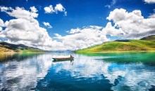 不同于西藏其他的神湖,巴松措(又名措高湖,藏語意為“三巖三湖”)完全被郁郁蔥蔥的原始森林所包圍。確實如它的名字般,巴松措是綠色的,是那種淡淡的玉石般沒有雜質的綠色。湖水清澈得可以看見兩三米下成群游動的魚兒。四周青山如黛,頂峰是終年不化的積雪。湖邊的雪山和湖面倒映的雪山彼此糾纏著,連綿不絕,很是壯觀!最難得的是,現在還很少有人到這里,完全一副與世隔絕的模樣。