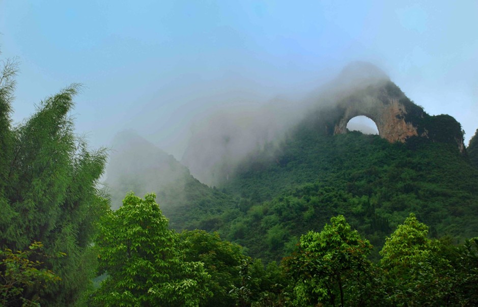 月亮山是陽朔境內的奇景,它位于高田鄉鳳樓村邊,高達380多米。因為山頂是有一個貫穿的大洞,好像一輪皓月,高而明亮,所以人們叫它明月峰,俗稱月亮山。游人可順著一條800多級的登山道直達月洞。這個月洞大得離奇,高寬各有50米,而山壁卻只有幾米厚。洞的兩壁平整似墻,洞的頂部卻掛滿了鐘乳石,形狀各異。其中兩塊很像月宮里的吳剛和玉兔。在晴天的時候,游人可以透過月洞看到藍天白云,好比一面掛在山顛上的圓鏡。由于月洞的北側有一座圓形的小山,所以游人走山南的賞月路,從不同的角度觀賞月洞,可以看到圓月、半月和眉月的不同景象。清代徐廷諍稱此景是月掛高峰,他作詩道:“峰巒頂上鏡光浮,旦夕空明未見收。自昔懸崖崩一角,至今遺魄照千秋。山穿月曜無圓缺。月出山輝任去留。萬古不磨惟此鏡,與君長作廣寒游。