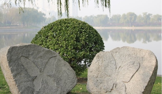 標(biāo)題:《蝴蝶夢》材質(zhì):花崗巖。高度:1米。作者:錢瑞澤。 創(chuàng)意:這個(gè)作品主要表達(dá)一種環(huán)保意識,假借史前化石的虛擬形象對滅絕的史前昆蟲之回憶,來呼喚人們對自然 的愛護(hù)。同時(shí),也嘗試地表現(xiàn)化石的質(zhì)感美,擴(kuò)大視覺美感的范圍,以試圖豐富雕塑的美感因素。安放在植物觀賞區(qū)東北側(cè),時(shí)間2000年5月。