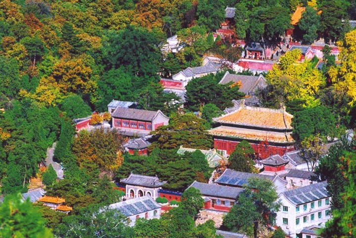 登上高大的毗盧閣,只見眼前殿宇嵯峨,整座寺院香煙繚繞,每座殿堂前的鐵焚爐、銅香爐內(nèi),成炷成把的高香燃盡一層又一層,煙霧升騰,彌漫全寺。透過青煙,鐘馨聲悠,幡幢微蕩。游人至此,仿佛置身于西天佛國的祥云慈霧之中,頗有一種出凡入圣之感。