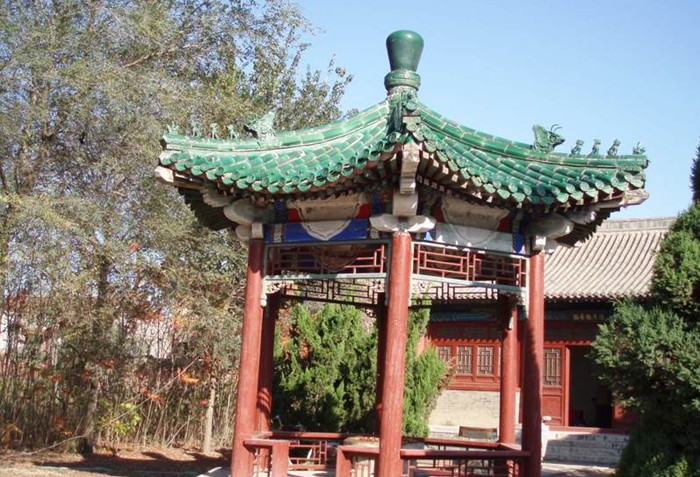 寶云寺內有一塔,高36.5米,塔體為八面棱錐體磚木結構,自四層以上四面有門,塔的各層建筑風格各異,或成鴛鴦斗拱,或成梅花斗拱,雄渾古樸,氣勢磅礴。若登塔頂,需有一定的勇氣,因為每登一層都要繞塔沿半圈,找到另一側的入口。