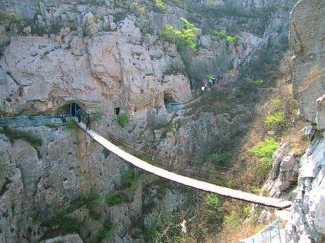 佛爺洞與七星洞有一峽谷相隔,景區(qū)開(kāi)發(fā)者便凌空架起一道35米開(kāi)的鐵索橋,把天塹變?yōu)橥ㄍ臼箖啥聪噙B,人踏鐵索橋一步九顫蕩悠悠,頓生“大渡橋橫鐵索寒”之感。不過(guò),這里的鐵索橋絕對(duì)安全,被人譽(yù)為“冀南一絕有驚無(wú)險(xiǎn)”是游人獵奇探險(xiǎn)鍛煉意志和膽量的絕佳場(chǎng)所。