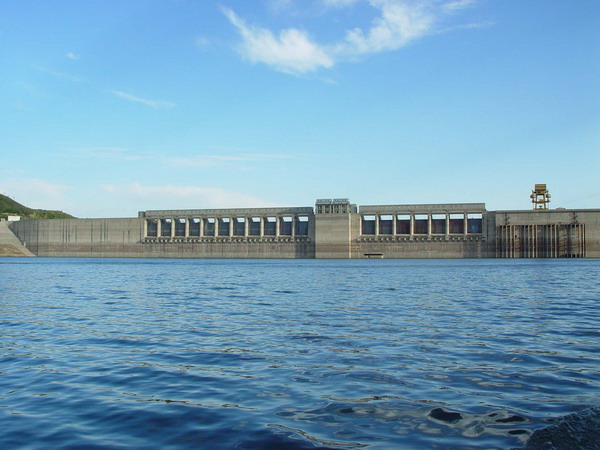 潘家口水庫主壩為砼低寬縫重力壩,按千年一遇洪水設計,五千年一遇洪水校核,壩頂長1039m,最大壩高107.5m,最大壩底寬90m,大壩中間部分設有18孔溢洪道,用15×15m弧形鋼閘控制,溢洪道最大泄洪能力為53100 立方米/秒。四個底孔,用4×6m弧形閘門控制,兩座副壩均為土壩,西城域副壩,脖子梁副壩一般情況不擋水。