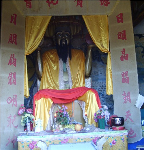 地處河北省滄州市北的青縣城南6公里有村曰“大盤古”,村西有座盤古廟。盤古廟始建于元世祖至元十五年(1278年),明弘治和崇禎年間曾重修,清康熙二十七年(1688年)因河流沖刷,設于秋祠西南重建,均有碑記。據文獻記載和民間傳說,當年的盤古廟狀似北京的故宮三殿,石、磚、木結構,琉璃瓦蓋頂,金碧輝煌,蔚為壯觀。前殿高三丈六尺,象征一年360天;臺階18級,為18層地獄之說;飛檐椽子108根,按36天罡、72地煞而布;每根椽頭系銅鈴一枚,照工、商、角、征、羽五音而置,有所謂“風搖鈴響天動樂,光照殿頂地生輝”之說。殿內有身披樹葉,手托日月的鐵鑄涂金盤古像,高一丈零八寸。中殿塑有南海觀音像,股坐蓮盆,金童玉女立兩側。版權所有山東聊城聊之旅國際旅行社有限公司,轉載必究!后殿設老君、孔子、龍王三塑像,殿前有合抱粗的合歡樹兩株,殿后鐵磬懸于古槐。可惜盤古廟在1947年毀于戰火。九十年代,當地群眾組織起來修復盤古勝跡,以滿足來此朝圣拜祖的人流尋訪。
