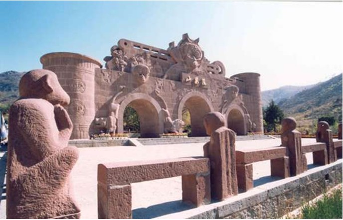 花果山山門建成于1996年7月1日。一到山門口,《西游記》氛圍便撲面而來。山門是在傳統古城門的骨架上,用現代表現手法加以渲染。正門上首為孫悟空的頭像,背襯圓形圖案,象征功德圓滿,法輪常轉。北側有唐僧師徒4人西方取經的浮雕,下方有6只圓雕雄獅把門,廣場四周有109只石猴迎賓。山門背面的匾額上鐫“東勝神洲”四字,為中國書法家協會代主席沈鵬先生題寫。透過中間的門洞,可看到松林中吳承恩雕像。