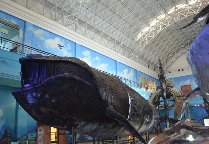 巨鯨展廳的展示主題是“海洋巨獸”。巨鯨是地球上現生的最大動物。幾個世紀以來,由于世界各地沿海國家的大規模捕殺活動,使巨鯨的資源遭到了嚴重破壞,其種群數量正在銳減,有的鯨類數量已到了難以恢復的境地,甚至面臨滅絕的危險。體型碩大的巨鯨令人驚奇且著迷,人們一生中很難有機會親眼見到這些龐然大物。本展廳展示了我館收藏的部分巨鯨外形和骨骼標本,有重達66.7噸的黑露脊鯨、52噸重的抹香鯨和34.7噸重的長須鯨等,這些館藏標本在世界各地的其他博物館都難得一見。