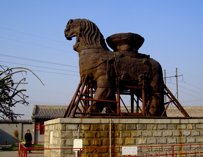 滄州鐵獅子位于滄州市政府駐地東南偏北16.5公里。坐落在東關村西0.5公里處。鐵獅身高5.78米,長5.34米,寬3.17米,體重約50噸。背負巨盆相傳是文殊菩薩蓮坐,獅身向南,頭向西南,兩左腳在前,兩右腳再后,呈前進狀,姿態雄偉,昂首闊步,徐徐如生鐵獅是我國大型的驚巧鑄鐵工藝。也是我國著名發源的古跡。距今已有一千多年的歷史,它充分的顯示出我國古代勞動人民的智慧和藝術才華。解放后鐵獅子受到了黨和政府的重視與保護,國務院首先把它列為全國第一批重點文物保護單位,并且對它進行各種的修繕。