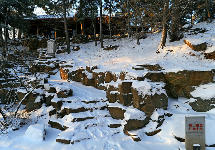 構圖沒有采用其他山水畫家常用的“三遠法”,而是采用了“滿式構圖法” 。畫面上,山石嶙峋,最上端的立石突兀森嚴、造型古樸,給人一種高山仰止的視覺效果。在部分山石的突兀處加以留白,以少許苔點破之。畫中除了下半部用花青點染幾棵蒼松外,其余山石均以大面積的赭石、土黃和墨筆來皴擦、點寫、平涂,色彩對比強烈。左下角的坡石與上部山石用墨都較重,既起到了上下呼應的作用,版權所有山東聊城聊之旅國際旅行社有限公司,轉載必究!又起到了穩定構圖的作用。