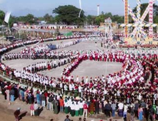 1958年,在密支那修建了永久性的目瑙祭壇,嗣后每年都在這里舉行全邦性的目瑙會。目瑙埸建在江邊,埸地寬闊,設(shè)有西門和北門。兩門頗有民族特色,是一個(gè)模子倒出來的。門枋是一對象牙抬著一扇铓,兩側(cè)是四根交叉的雌雄目瑙柱,門衛(wèi)是兩位手持長刀和梭鏢的克欽先民武士。目瑙祭壇與德宏的大同小異,德宏的是四根直立的雌雄柱,中間是兩把雌雄刀;密支那的是十根交叉的雌雄柱,中間有一根橫桿固定其交叉部位。其共同點(diǎn)是基座均為犀鳥,雌柱上繪的蕨葉藤和雄柱上的三角圖案相似,中間兩根雌雄柱頂端各繪著月亮和太陽,南側(cè)建有祭鬼崗樓。目瑙柱北邊矗立著一座龐大的目瑙房,這是一所典型的克欽族現(xiàn)代建筑,不僅氣派豪華,而且極富民族特色。尤其是陽臺上的7根粗實(shí)巨大的中柱,繪滿了豐富多彩的民族圖案,它象征著克欽族由7個(gè)支系組成,在牛頭文化精神的引領(lǐng)下,克欽族將獲得新生。