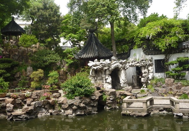 積玉水廊倚豫園東圍墻,臨曲池,積玉峰立于廊間。積玉峰玲瓏剔透,原在也是園內,1956年移到豫園。池西及玉華堂前后,流水瀠洄,山石嵯峨,花木扶疏,植白玉蘭、白皮松、翠竹,幽雅恬靜。