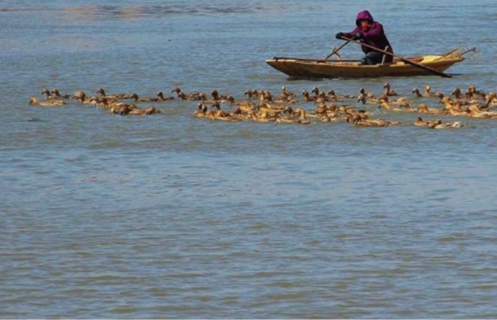 金風送爽的秋天,正是湖上收獲的季節。漁舟來往穿梭,鸕鶿水下翻騰。喜看船艙中,不是活蹦亂跳的魚蝦,就是潔白似玉的白蓮藕和沉甸甸的香稻。湖區人民沉浸在豐收的喜悅之中。