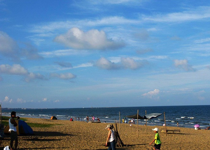 這里的海灘特別平整,每天可以看到兩次漲潮落潮奇觀:落潮時(shí)海水迅速消失,僅剩下裸露的萬(wàn)畝灘涂和來(lái)不及回到大海的魚蝦蟹貝;漲潮時(shí)海水八方齊涌,萬(wàn)畝灘涂迅即淹沒,極為壯觀。