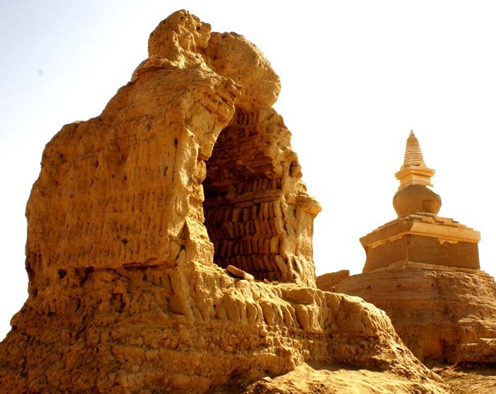 黑城市北方的西夏國古都,名叫亦即乃,就是黨項語的黑水城黑城平面為長方形,現今城墻仍高聳地表達10米城內的街道和墻壁及整齊排列的木頭檐柱,從流沙中露出。城外西南方,一座穹坊廬式頂、壁龕樣式的禮拜堂完整地矗立于荒野,土坯建成的圓頂清真寺尚未被風沙掩埋。城外西南一座禮拜堂完整屹立于荒野,近代有不少人來多次探寶,掠奪走了大量的珍貴文物,在黑城出土的不少珍貴的歷史材料中,在出土的《番漢合時掌中珠》西夏文字典中,人們解讀了西夏文。給后人更完整的詮釋了神秘的西夏國。該城建于公元九世紀的西夏政權時期。公元1372年明朝大將馮勝攻破黑城后遭廢棄。至今城內還埋藏著豐富的西夏和元代等朝代的珍貴文書。近年來,由于周邊地區沙化嚴重,流沙從東、西、北三面侵蝕黑城,許多遺址已埋于沙下。文物保護工作者呼吁有關部門盡快行動起來,搶救性保護黑城遺址。黑城遺址的城墻西北角頂部筑有5座佛塔,保存至今尤為珍貴,但同樣面臨風蝕坍塌的危險。