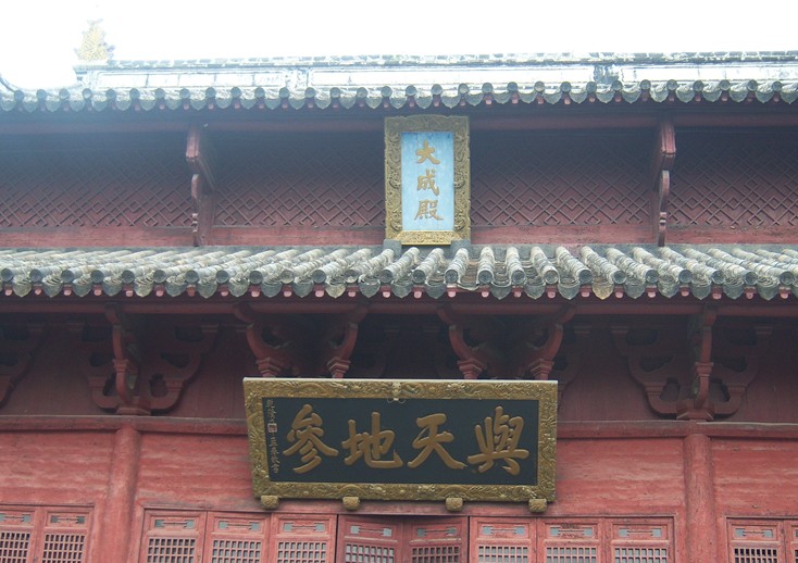 下泮橋即至大成門(mén)。此門(mén)系門(mén)廳式梁森構(gòu)架,闊三開(kāi)間。硬山到頂,筒瓦頂蓋,正脊兩面三刀端裝飾鰲魚(yú),四角凌空飛翹。門(mén)廳前后之間設(shè)壁隔內(nèi)外廳,并列辟門(mén)三道,中門(mén)屹立一對(duì)石獅,兩邊側(cè)門(mén)各置兩只石鼓。毗連門(mén)兩面三刀側(cè)的崇圣祠、土神祠、各三間,坎墻上軒要格通窗。廳、祠并列相依,刪繁脫俗,獨(dú)具匠心。