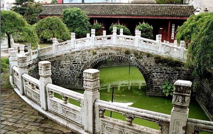 向前十步臨半月形泮池,池上有磚石拱橋,池橋皆以漢白玉石雕欄桿護(hù)配。池中碧水漾漾,金鯉嬉戲,甚是賞心悅目。傳聞明清季桐城如“天啟六君子”之一的左光斗、“百科全書(shū)式”大哲學(xué)家方以智、“父子雙宰相”張英、張廷玉以 “桐城派”鼻祖戴名世、方苞、劉大魁、姚鼐等到近千們名臣碩儒,于成名前均從橋上步入大成殿祭孔,以到金榜題名,幫譽(yù)“泮橋”為“狀元橋”,迄今人們?nèi)砸暤撬箻驗(yàn)榧槿缫庵畼?lè)事。