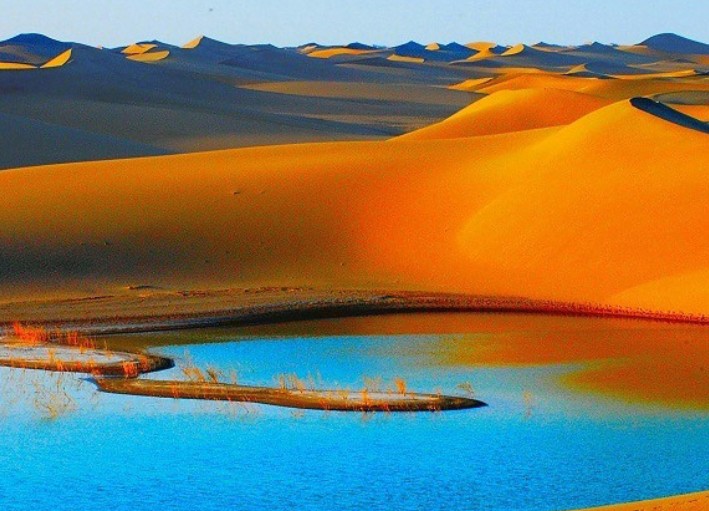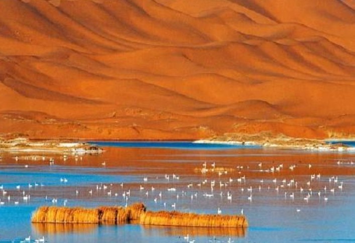 騰格里沙漠天鵝湖已成為阿拉善盟開展沙漠探險和生態(tài)觀光的最佳旅游地。