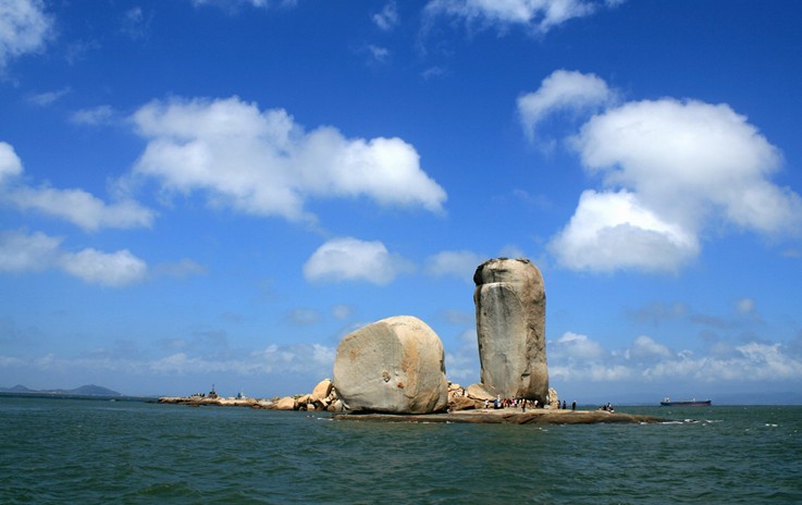 從看澳村岸邊坐渡船,十幾分鐘就到達礁石上,礁石底部是一組平坦完整的巖石。兩個石柱均由粗粒灰白色的花崗巖組成 東側的一個高達33米,胸寬9米,厚8米;西側的一個高17米,胸寬15米,厚8米。版權所有山東聊城聊之旅國際旅行社有限公司,轉載必究!兩個石柱的底部都是近似四方形體,直立在礁石上。據地質學家考證是世界上最大的花崗巖球狀風化海蝕柱。由于它的奇特壯觀,對游人有著強烈的震撼力和吸引力。建設部與中科院的專家稱之為:“壟斷性的世界級旅游資源。”明代旅行家陳第曾譽之為“天下奇觀”, 清朝女詩人林淑貞詩贊:“共說前朝帝子舟,雙帆偶趁此句留;料因濁世風波險,一泊于今纜不收.