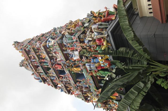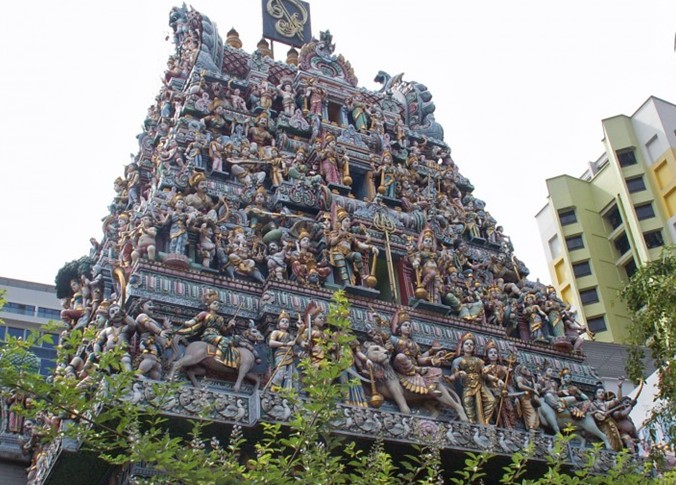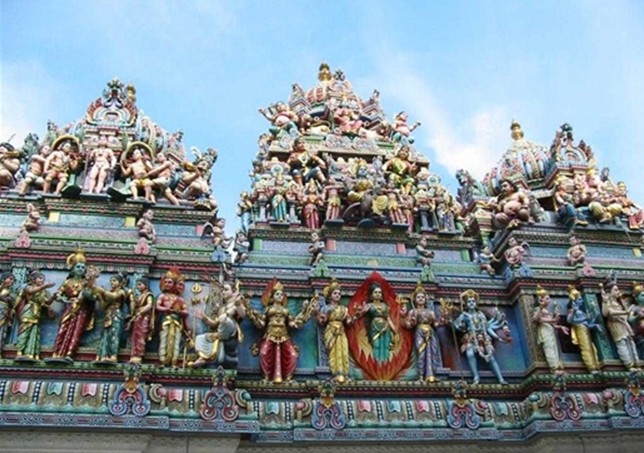 維拉瑪卡里雅曼興都廟(Sri Veeramakliaman Temple)建于1855年。特殊的彩繪門樓屬典型的南印度建筑風格,門上高聳的塔樓上裝飾許多立體的彩色神像,廟里則是供奉主掌生死的"卡莉女神"(Kali)。雕刻在門樓上的印度教諸神與圣物牛、斗士等,在太陽的照耀下閃閃發光,耀人眼目。寺廟周圍的墻壁,都被涂成紅白色,極富喜慶氣氛。