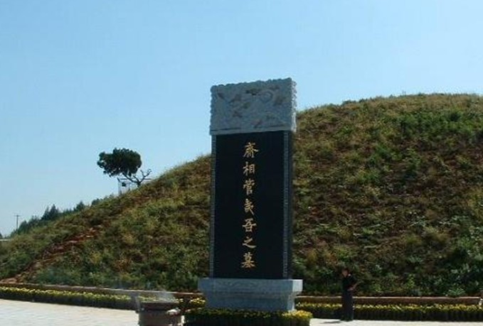 在臨淄城南牛山北麓,墓高14米,東西34米,南北近14米。后人登臨牛山,總免不了在管仲墓前留連一番,毛維騶曾慨嘆:“幸脫當年車檻災,一匡霸業為齊開。可憐三尺牛山土,千古長埋天下才”。舊時墓前曾立一石碑刻有此詩,今已無存。