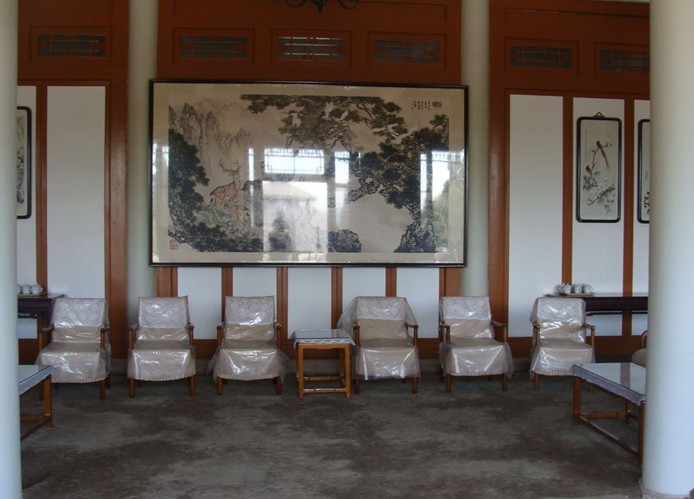 前客廳一共有五間房屋。靠東靠西的各一間用布簾與中間相隔,使中間三間室內顯得靜謐祥和。周恩來接見外賓、會見客人等均在這中間三間房里舉行,周恩來一般坐在東邊主席位置上,西邊是主要客人的客席座位,會見時如用翻譯,就在后邊加上兩把椅子和一只小茶幾就行了。兩側是主要陪同人員坐位,如果隨行陪同人員太多,也可以臨時多放幾把椅子。周恩來在建國初期曾在這里會見原蘇聯駐中國大使羅申,原印尼總統蘇加諾等人。一般東側布簾內的那間房子里放置有茶水、茶具。版權所有山東聊城聊之旅國際旅行社有限公司,轉載必究!這樣好方便工作人員隨時送上;西側布簾內的那一間放置有小圓桌兩張。周恩來有時會見國內外的知心客人或朋友時,談到吃飯時間了,為了節省時間,也會讓工作人員在后邊簡易鍋灶上燒幾個菜招待客人,邊吃邊談,吃完飯繼續談。象越南的胡志明主席、柬埔寨的西哈努克親王、國內的廖承志同志等都在大廳里和周恩來一起用過餐。
