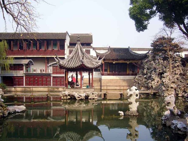 園內水體聚中有分。聚合型的主體水池中心有亭佇立,曲橋連亭,似分似合,水中紅鱗躍波,翠柳拂水,云影浮動,真是“半畝方塘一鏡開,天光云影共徘徊”。水源的處理更是別具一格,在園西假山深處,山石做懸崖狀。一股清泉經湖石三疊,奔瀉而下,如琴鳴山谷、清脆悅耳,形成了蘇州古典園林引人注目的人造瀑布。園中水景豐富,溪澗泉流,迂回于洞壑峰巒之間,隱約于林木之中,藏尾于山石洞穴,變幻幽深,曲折豐富。